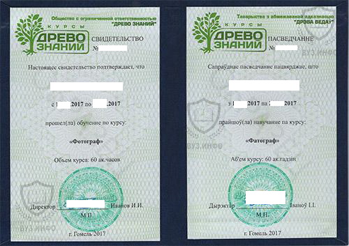 Для примера приведу образец документа от нашего сопредельного государства — Республики Беларусь. Его мы делали буквально вчера. В России выдают похожие корочки, но бывает, что делают и другого образца. В виде грамоты или сертификата. Мы можем изготовить любой из этих документов.