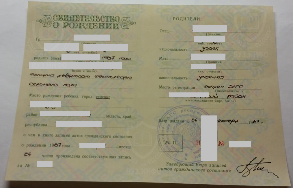 Чтобы восстановить свидетельство о рождении сегодня не обязательно ехать в свой ЗАГС по месту рождения. Можно просто купить свидетельство о рождении на ВУЗ.ИНФО. Также можно сделать его с нужными вам данными. Цена от этого не увеличится.